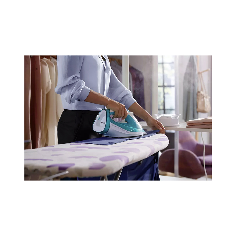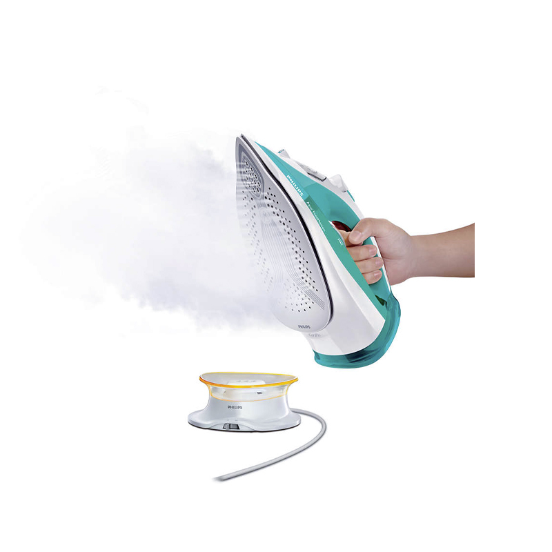 Fer à repasser PHILIPS Azur FreeMotion est doté d'une puissance de 2 400 W pour une montée en température rapide et de hautes performances sur tous vos vêtements repassables. Le voyant intelligent indique l'état du fer à tout moment. La couleur Bleu signifie que votre vêtement est prêt à repasser et le Orange vous montre que votre appareil à besoin de (re)charge nécessaire.