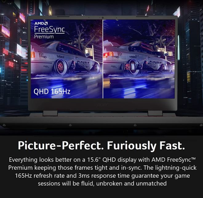 l'écran QHD de 15,6 pouces avec AMD FreeSync Premium donne à chaque image un aspect dense et synchronisé. Explorez votre monde de jeu en détail QHD avec une résolution de 2560 x 1440. Avec un taux de rafraîchissement ultra-rapide de 165 Hz et un temps de réponse de 3 ms2, vos sessions de jeu seront fluides, sans bégaiement et sans précédent. Vous pouvez maintenant obtenir des photos réflexes avec une précision extrême et un minimum de fantômes.