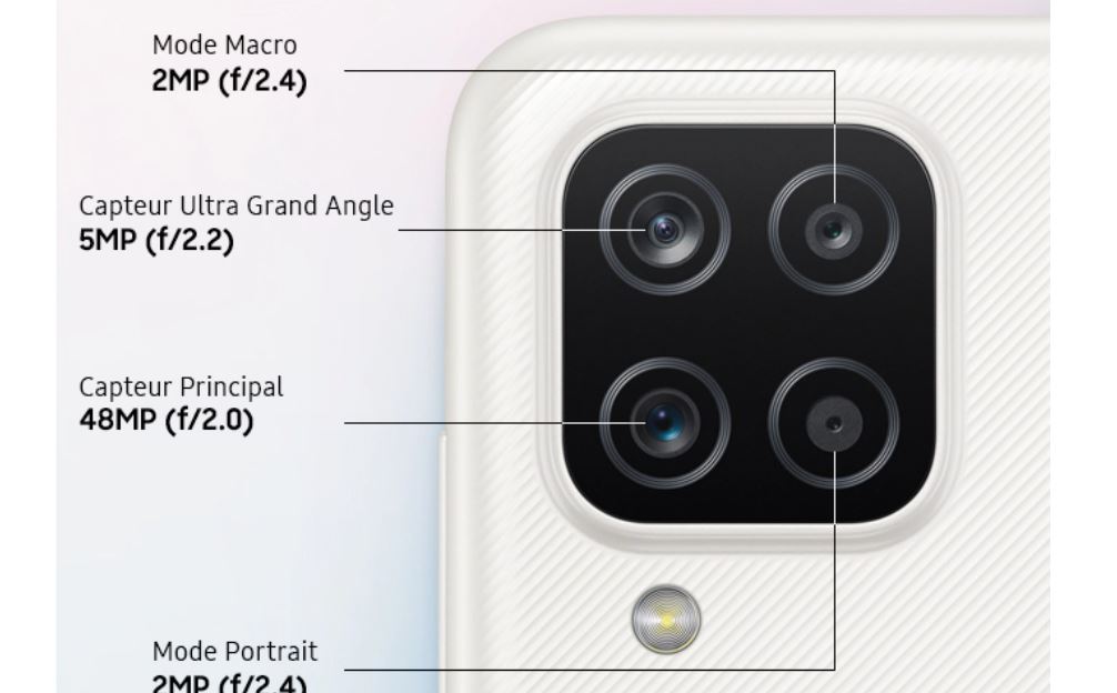 Le samsung A12 pas cher vous présente ses trois caméras arrières 48+5+2+2 MP. Le capteur 48 MP (large) vous permet d'avoir des images de façon précise et détaillé. Il film l'objectif de manière claire avec plus détails de la cible sans toutefois déformer l'image. La camera 5 MP ( ultra large), permet de photographie sur un angle de 120° pour une image impeccable. Les capteurs 2MP (macro et profond) sont très importantes. Leurs rôles sont de capturer les images de façon plus approfondie en une seule prise. De plus, nous avons son tireur selfie 8 MP. Ce dernier vous permet de réaliser des superbes photos selfie avec un résultat parfait et sublime.