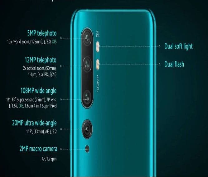 Le xiaomi Mi Note 10 pro est moins cher dispose de 5 caméras pour des prises de photos épatantes 108MP+ 12MP + 8MP + 20MP + 2MP, avec une résolution photo unique pouvant atteindre 1080 x 2340 pixels, 12 fois plus élevée que la résolution 4K. Avec un très grand capteur d'image d'une taille de 1 / 1,33 ". Achetez ce téléphone et utilisez un téléphone avec un appareil photo qui est plus qu'un appareil photo numérique. Également avec un téléobjectif 8MP qui vous donne le bon zoom.