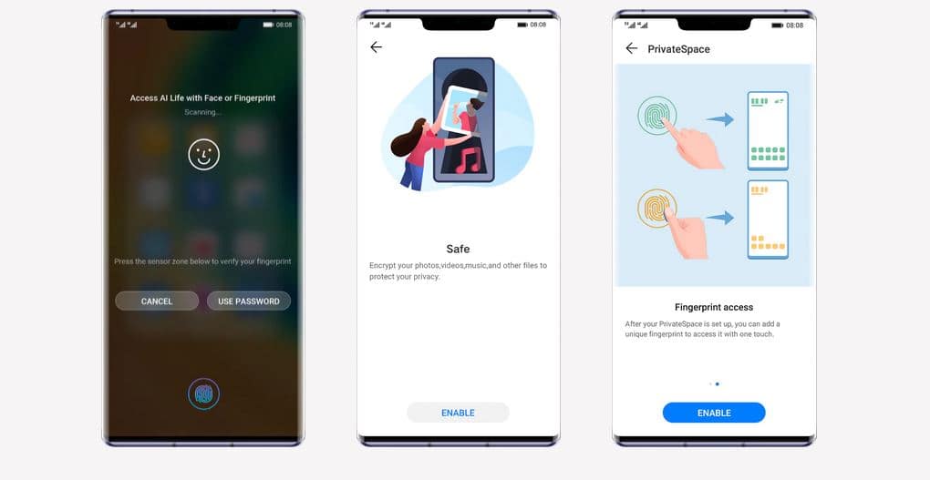 Un simple effleurement naturel de l'écran déverrouille votre téléphone à une vitesse ultra rapide. Votre empreinte digitale est unique et profitez donc d'une sécurité élevée avec Huawei mate 30 moins cher.